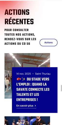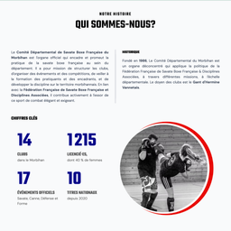 Le Comité Départemental de Savate Boxe Française du Morbihan fédère 14 clubs et 1190 licenciés. Entre championnats, formations et actions citoyennes, la coordination nécessitait un outil centralisé performant. Le CD 56 nous a sollicités pour créer une plateforme web associative simplifiant la gestion quotidienne tout en valorisant les quatre disciplines pratiquées.